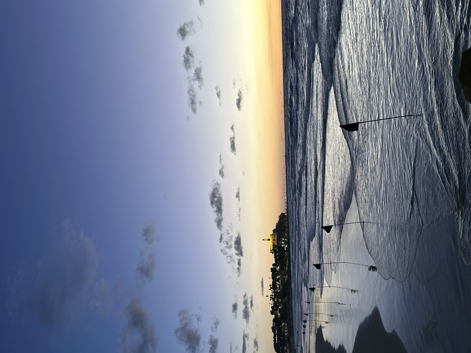 - "A beach scene at dusk shows a coastline with small black flags marking the edge of the water" by FM-jqiIm2, licensed under CC BY 4.0