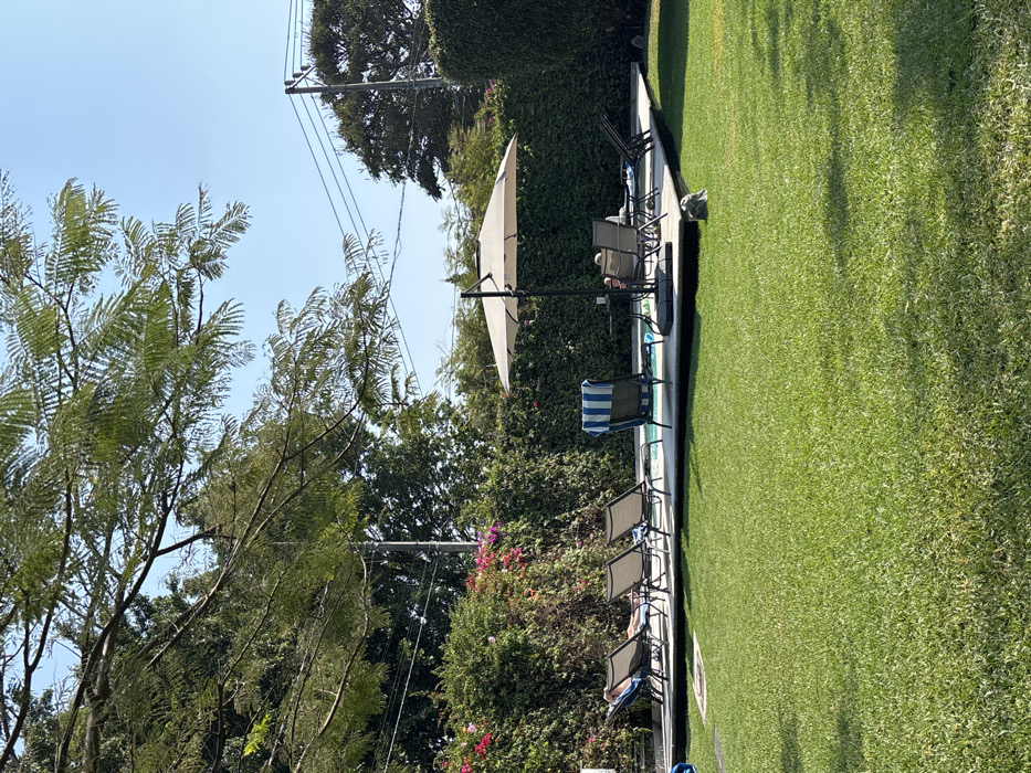 grassy lawn with a pool alongside a stone patio. Several lounge chairs are placed beside the pool, some under a large umbrella. Lush green trees and bushes fill the background. A utility pole with wires is visible above the trees, under a clear blue sky. The photo is taken at an angle, presenting a slightly skewed perspective of the scene.
