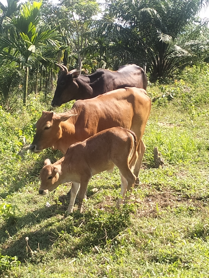 A line of three cows stands in a grassy field under bright sunlight. The first cow, dark brown with horns, is partially obscured. The second cow, a light brown, is more visible. A young calf, a lighter brown still, stands in the foreground. The field is filled with green grass and small plants, while trees, including palm trees, form a backdrop.