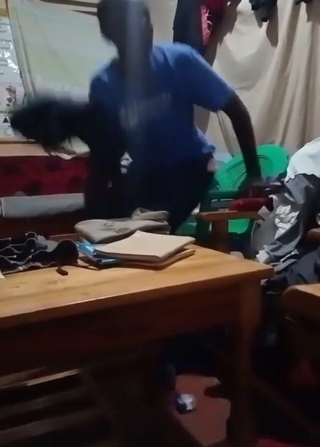 A person in a blue t-shirt and dark pants is hanging clothes on a clothesline inside a room. The room has a wooden table with books on it, a green plastic chair, and other clothes hanging and piled on the furniture. The clothesline is attached to the ceiling. The person is standing and reaching up to hang the clothes.