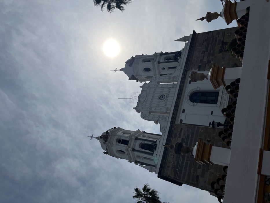 A low-angle shot of a large, ornate church. The building features two prominent bell towers with crosses atop their domes. The facade is a mix of white and dark stone, with arched windows and decorative details. The sky is overcast with the sun shining brightly. The foreground includes sections of palm trees at the top and bottom corners of the frame.