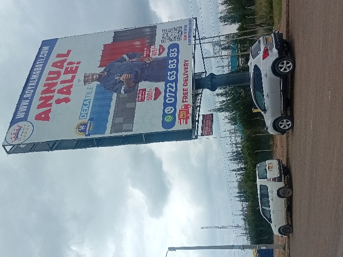 The image captures a roadside scene in Nanyuki, Kenya, under an overcast sky. A prominent, large rectangular billboard stands vertically in the center, supported by a thick dark pole. The billboard displays an advertisement for "ROYAL MABATI ANNUAL SALE!" and "DEKA TILE" with a "50 YEAR WARRANTY," featuring a smiling Black man in a hard hat and blue work uniform giving a thumbs-up. Samples of blue, dark patterned, and red roofing materials are shown, along with prices "500/-" and "405/-", contact numbers "0722 63 83 83" and "0730 423 550," and the text "FREE DELIVERY." Below the billboard, two vehicles are parked on a dirt shoulder next to a paved road. On the left, a white Toyota Probox station wagon is positioned with its rear visible. To its right, a silver Nissan Qashqai SUV is also parked, presenting its rear. In the background, a dense line of green vegetation screens the view, behind which a tall metal lattice tower, utility poles, and power lines are visible, along with parts of distant buildings featuring blue roofs.