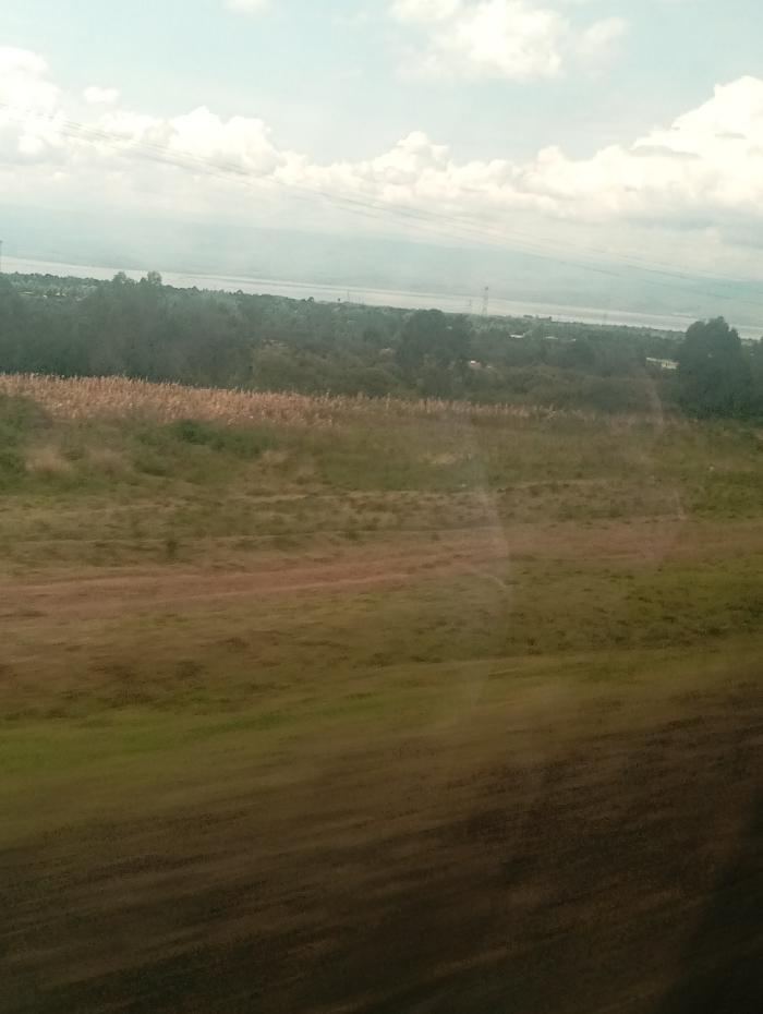 The image captures an expansive outdoor landscape within Hells Gate ward, Kenya, under a pale blue sky with scattered white cumulus clouds. The immediate foreground is a blurred field of dark brown and green earth, suggesting motion. Above this, a wide swathe of light brown and greenish vegetation, consistent with dried grasses or reeds, stretches across the mid-ground. Further back, a dense, dark green treeline forms a horizontal band, partially revealing faint, light-colored structures within its foliage. Beyond the trees, a large body of water, likely Lake Naivasha, is visible as a light grey-blue expanse, with hazy, undulating mountains delineating the distant horizon. Multiple tall, metallic power transmission towers are discernible in the background, extending across the landscape on both sides of the water. No individuals, specific actions, or interactions are depicted in the scene.