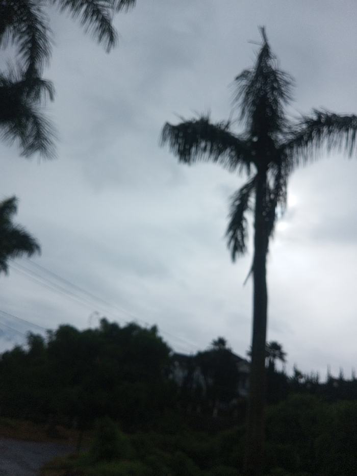 Palm trees stand silhouetted against a cloudy, overcast sky. The dominant tree is centrally positioned, reaching towards the upper frame. Its fronds extend outwards in a cross-like shape. Dark, undefined foliage and possibly a building sit below on an incline. A faded road is visible at the bottom left. Other palm trees are seen on the top left corner and in the middle ground. The overall tone is muted and indistinct, with poor clarity and a somber atmosphere.
