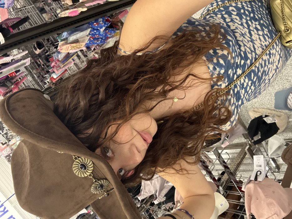 A woman with curly brown hair and a brown cowboy hat with circular adornments poses for a selfie in a retail environment