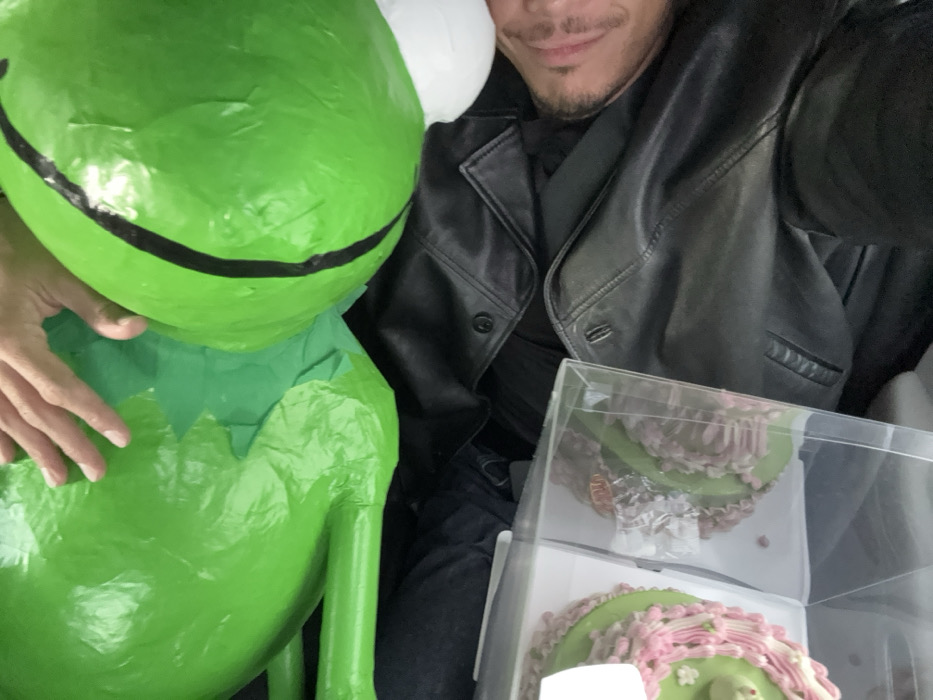 The image displays a close-up, downward-angled perspective of a scene in Mexico City, Mexico. A large, bright green, cylindrical object, possibly a piñata or character effigy made of lightweight material, occupies the upper portion of the frame, featuring a black vertical stripe on its rounded surface. A light-skinned hand is resting on its textured, somewhat crumpled surface. Below this object, a male subject is partially visible, showing the right side of his face with light facial hair and his torso clad in a black leather jacket. To the lower left, two small, round cakes are presented in clear plastic boxes. Each cake features a green base frosting adorned with intricate pink decorative piping.