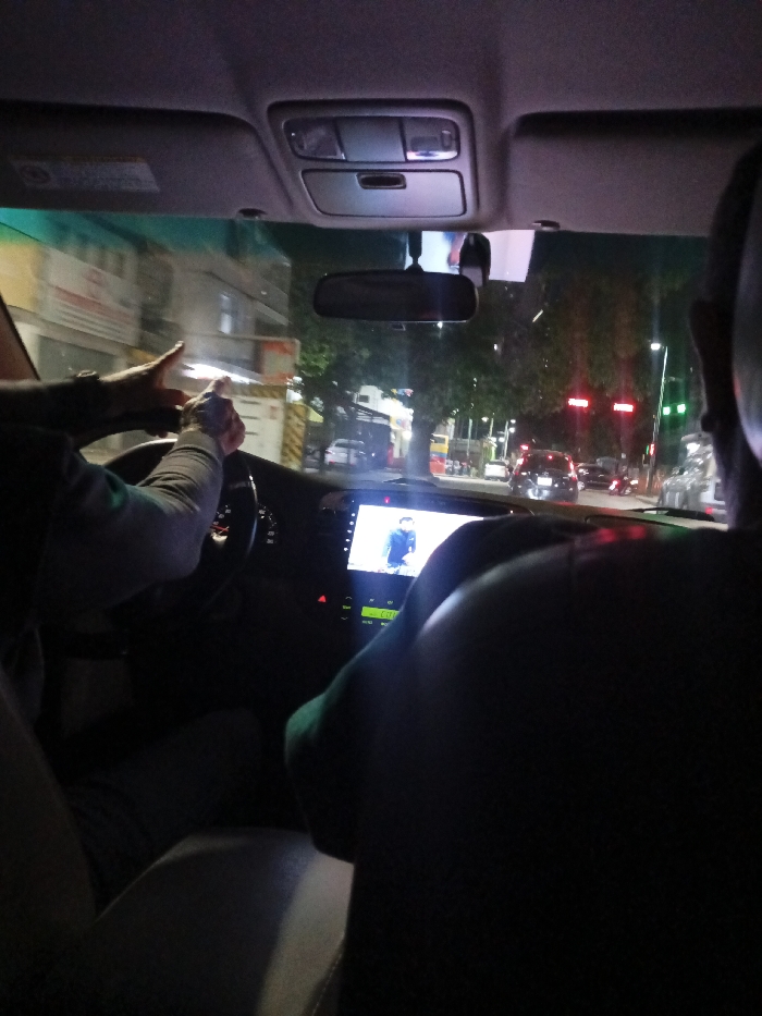 Inside a car at night, a driver gestures with his left hand. The car's dashboard screen displays a person, possibly from a video. Through the windshield, streetlights illuminate buildings and trees. Traffic signals are visible in the distance. The view is partially obstructed by the back of the passenger seat.