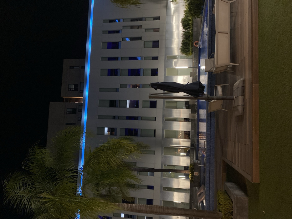 An exterior view at night shows a tall, modern building with a blue light accent. The building features a grid of windows. A swimming pool runs along the building's base with lounge chairs and a closed umbrella nearby. A palm tree is visible in the foreground, adding a tropical element to the scene. The ground around the pool is a mix of wooden decking and green grass.