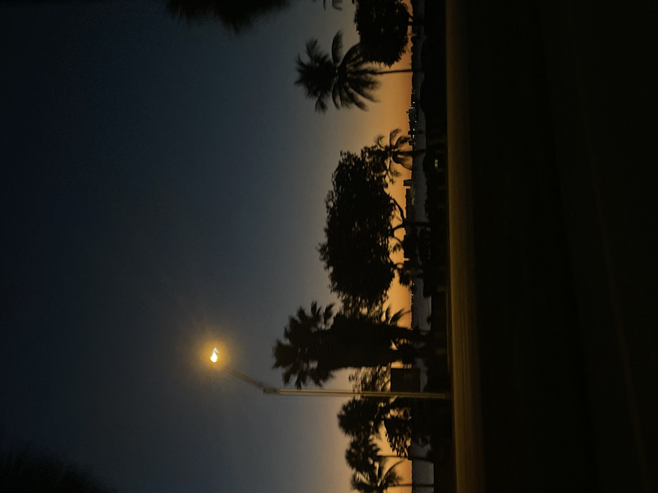 A picturesque landscape unfolds with a vibrant sunset casting warm hues across the horizon. Silhouetted palm trees and lush foliage create a striking contrast against the colorful sky. A solitary street lamp illuminates the scene, adding a touch of urban charm. Distant city lights twinkle faintly in the background, hinting at a bustling cityscape beyond the tranquil shore.
