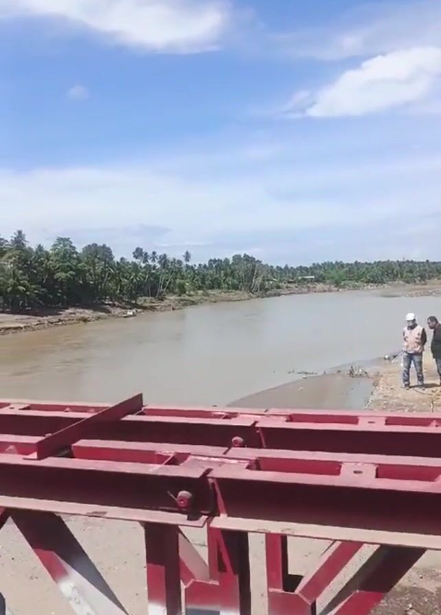 From the vantage point of a structure, possibly a bridge under construction, the video shows a wide, muddy river flowing beneath a bright blue sky dotted with wispy clouds. The far bank is lined with lush, tropical trees, predominantly coconut palms. Visible in the foreground is the red and white steel framework of the structure, partially obstructing the view. The Indonesian flag, a red and white bicolor, is fixed to the structure's edge, waving gently in the breeze. Two figures stand on the riverbank, one wearing a light-colored hat, seemingly engaged in activity near the water. The scene suggests a sunny, possibly tropical location, with riverbank restoration or construction underway.