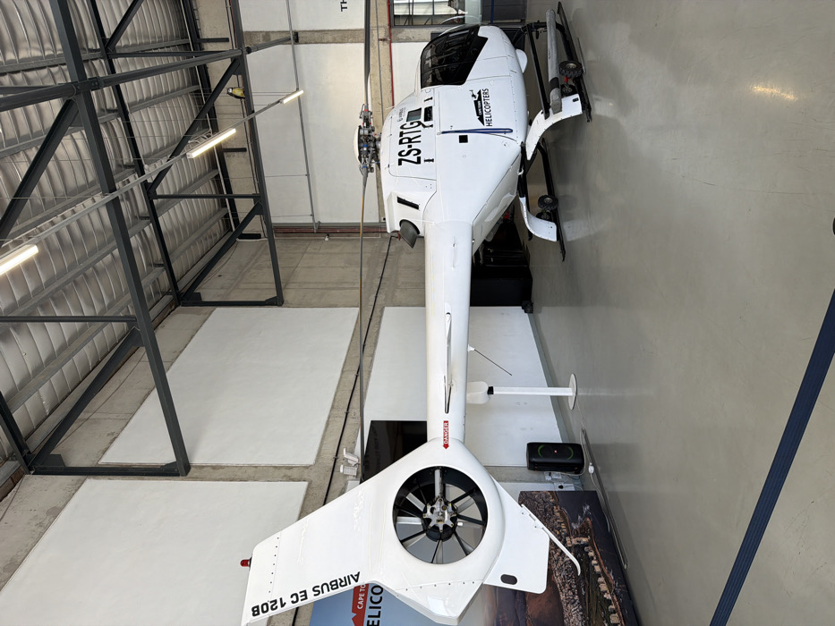 This image depicts the interior of a commercial hangar or showroom associated with Cape Town Helicopters in Cape Town, South Africa