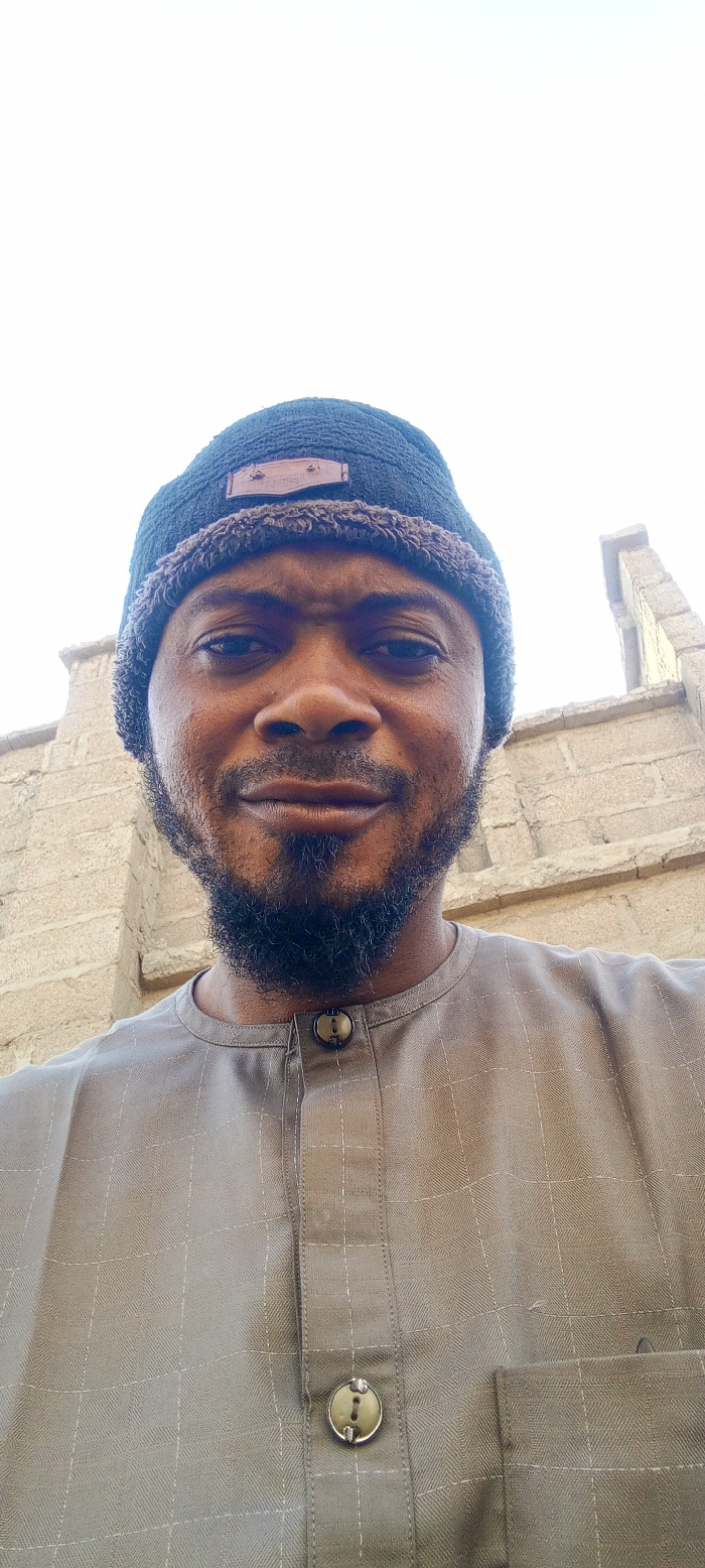 The image displays a male individual, an adult, in a close-up, upward-angled portrait within the city of Dan Maliki, Nigeria