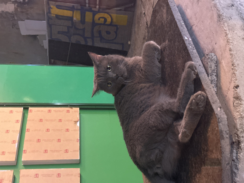 An adult domestic cat, exhibiting dense grey fur consistent with a Russian Blue or similar breed, is observed in a reclined, alert posture on a dark, speckled stone slab. Its front paws are tucked beneath its body, with one slightly extended forward. The cat's head is raised, ears are slightly flattened back, and its eyes are wide and focused forward, pupils appearing dilated. Distinct white whiskers protrude from its muzzle. The scene is an interior or semi-enclosed commercial space in Nha Trang, Vietnam. The cat's slab rests on a lighter, possibly concrete or tiled base. Behind the cat and to its left, a bright green vertical panel or wall is visible, to which several rectangular, light brown, possibly wood or particle board, panels are affixed. These panels display a repetitive pattern of small, reddish-brown square insignias. To the right and behind the green panel, the background is darker and less defined. A large, reflective object or sign is partially visible, featuring what appear to be large, indistinct Cyrillic characters (e.g., 'Г', 'р', 'Л'), suggesting a commercial or informational sign. No human subjects or interactions are present. The lighting is ambient, originating from an unseen source, illuminating the cat and foreground more brightly.