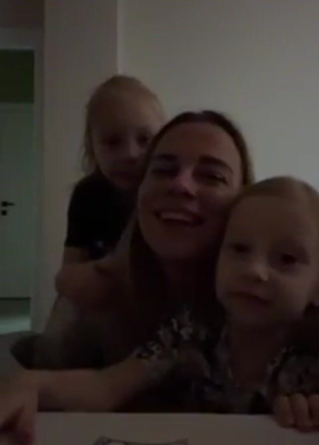 A woman with light brown hair and two young blond girls are in an interior space. One girl is standing behind the woman, with her arms around her neck. The other is seated at the desk next to her. The woman kisses the camera and smiles. The room is dimly lit, and a door is visible in the background. A desk is in the foreground, and a purple object sits on the desk. The three subjects are posing for the camera.