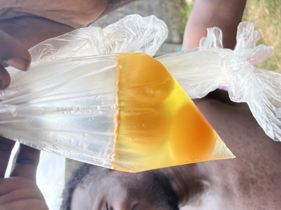 A close-up image captures a dark-skinned individual, partially visible on the left, holding a clear plastic bag containing approximately three raw chicken eggs. The eggs consist of distinct orange-yellow yolks suspended within clear albumen. The individual's face, displaying a smile, is partially cropped on the left, revealing short, dark hair and the upper portion of their bare chest or shoulder. A dark-skinned hand grasps the top of the plastic bag. The background, largely out of focus, suggests an outdoor setting under a bright sky, with blurred elements of light-colored structures and sparse greenery. The scene is located in the city of Epe, Nigeria.