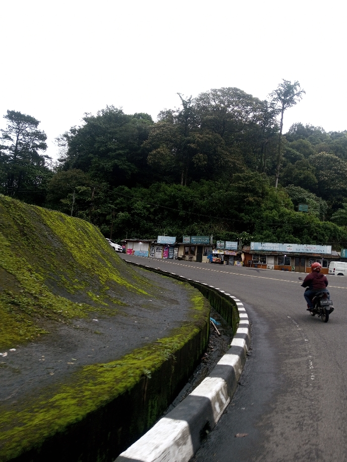 The scene is located in the city of Bangtsho, Bhutan. The image presents an outdoor view of a curved asphalt road with a moss-covered embankment, roadside shops, a person on a motorcycle, and a densely forested hill under an overcast sky. In the left foreground, a steep retaining wall or natural bank with a dark base is extensively covered in vibrant green moss, exhibiting vertical growth patterns. The wall curves towards the midground, parallel to the road. To its right, a paved, two-lane asphalt road also curves gently to the right. A curb with alternating black and white stripes separates the road from a narrow, dark drainage ditch that runs alongside the mossy bank. The road surface appears slightly damp. In the midground, a solitary individual, wearing a red or maroon jacket and a red helmet, is operating a dark-colored scooter-style motorcycle. The rider is moving away from the viewer, turning right along the road. Further along the right side of the road, a series of at least five small, individual shop structures are aligned. These modest buildings have dark, possibly corrugated metal roofs and their facades are adorned with various signs and posters. Visible text on some signs includes Indonesian script and terms, such as "WARUNG SEKAR AJI," "MIE AYAM BAKSO," and "ES TEH." A white van is partially visible parked near the shops on the far right, and a white car is parked on the left side of the road, closer to the mossy bank, just before the first visible shop. The background is dominated by a large, undulating hill or mountain slope, densely covered with a variety of dark green trees, indicating a thick forest. The sky above is uniformly bright white, suggesting overcast conditions.
