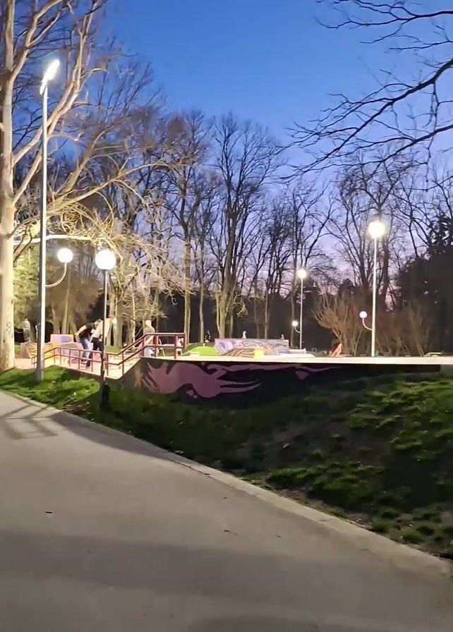 The camera captures a nighttime scene at a skate park, possibly at dusk. The sky is a gradient of blues and purples. Several bare trees stand around the park, interspersed with evergreen trees. Street lamps illuminate the scene. A concrete skate park is situated on a raised platform, accessible by a ramp with red handrails. The platform's facade is decorated with a black and pink graffiti mural. On the skate park, people are engaged in various activities: skateboarding, riding bikes, and spectating. The foreground features a concrete path, edged by a grassy slope leading up to the skate park.