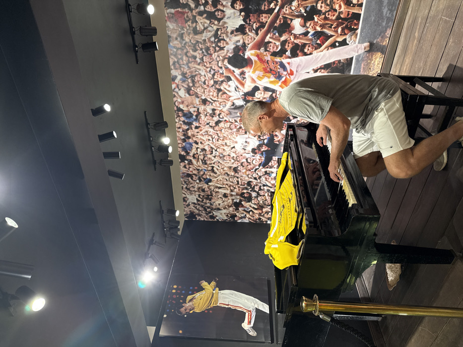 The scene is an interior view of the Freddie Mercury Museum in Stone Town, Zanzibar, Tanzania. An adult male is seated on a dark wooden stool, playing a black grand piano. He is Caucasian, middle-aged, with short grey hair and glasses, wearing a grey short-sleeved shirt, white shorts, and light-colored athletic shoes. A bright yellow garment rests on the piano's closed lid. A brass stanchion with a black rope is positioned to the left of the piano. The walls are dark, displaying large graphic murals. The left mural depicts Freddie Mercury in a yellow jacket and white trousers, performing. The rear wall features a large image of a concert crowd, over which a separate image of Freddie Mercury in a colorful tank top and white trousers is superimposed, mid-performance. The ceiling is black and equipped with multiple track spotlights illuminating the exhibit area. The floor is constructed of dark wood planks.