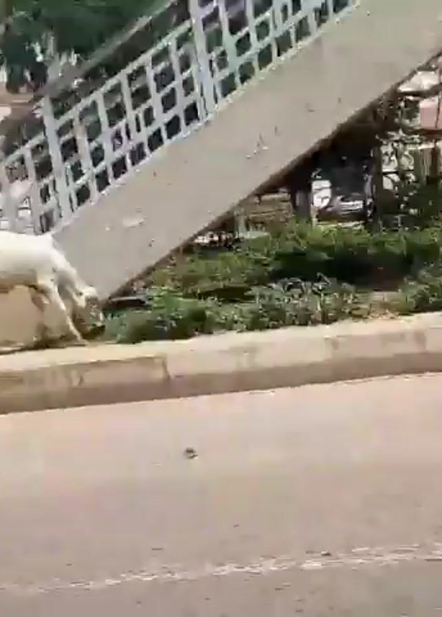 several white cows walking along a roadside. The camera is moving, presumably from a vehicle. In the background is a building and a pedestrian overpass. The cows are walking on the grass next to the sidewalk and then cross the street. There is also a small calf walking with the group.