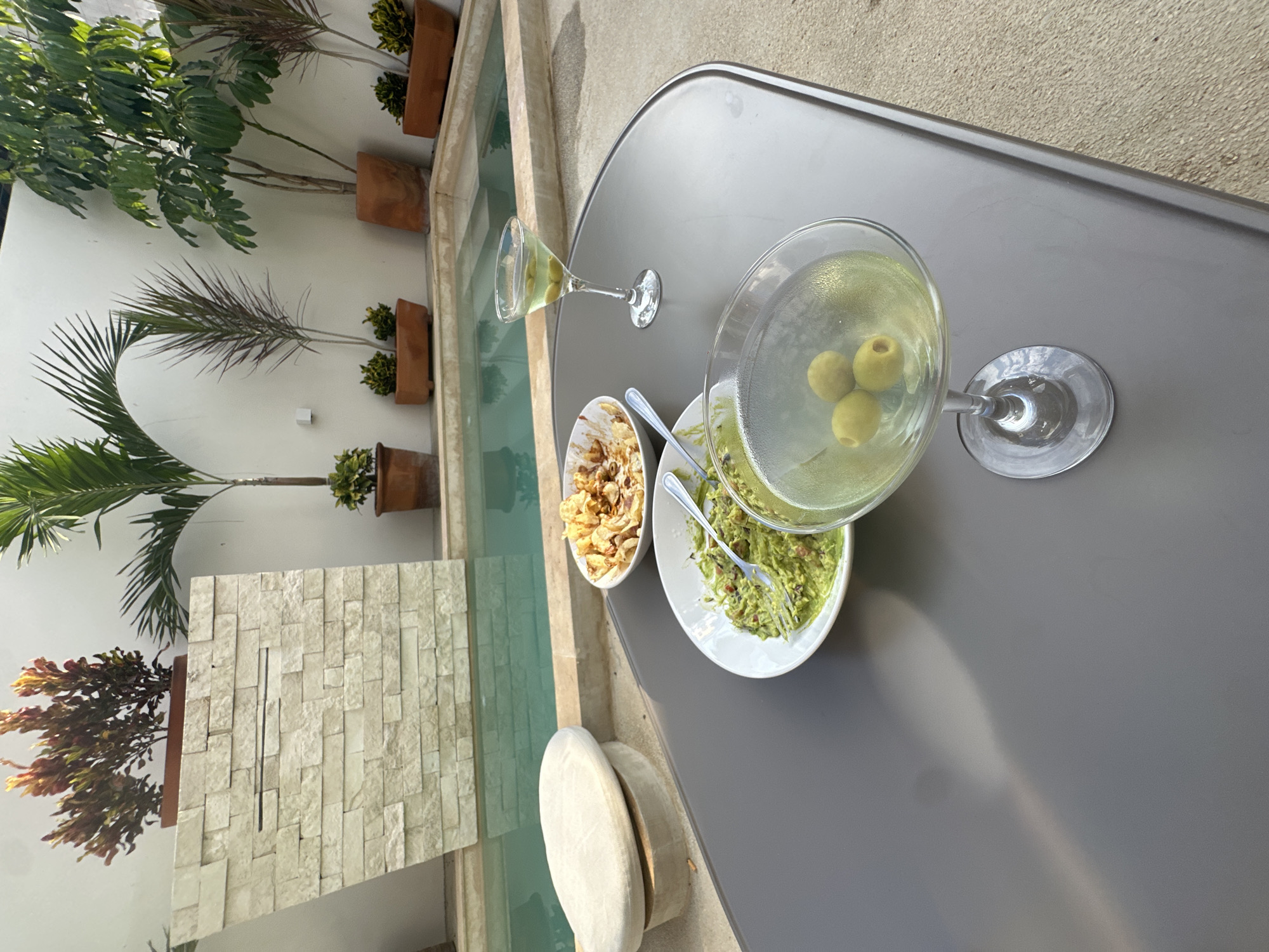 table with a meal and drinks outdoors. On the table, there is a martini glass with three olives, a glass with a greenish liquid, a bowl of guacamole with two forks, and a bowl of chips. The table is grey. Beside the table is a circular cushion. Behind the table is a pool with a stone wall. There are plants in pots along the wall. The image was taken in Brisas de Zicatela, Mexico.