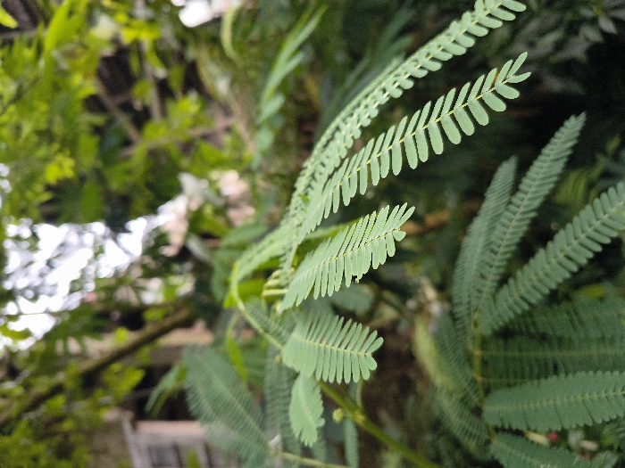 The image displays a close-up, shallow depth-of-field photograph of green foliage, located within An Khe Ward, Vietnam. The foreground is dominated by several sharply focused, compound leaves, characterized by numerous small, oval leaflets arranged symmetrically along multiple stems. These leaves exhibit a uniform medium-green coloration. The background is rendered in a soft, blurred bokeh effect, presenting indistinct masses of lighter and darker green foliage interspersed with diffused bright light. A faint, rectangular structural element, possibly a building or window, is discernible in the upper-left quadrant of the blurred background. No human subjects, animals, or observable actions are present within the frame. The scene is illuminated by natural light.