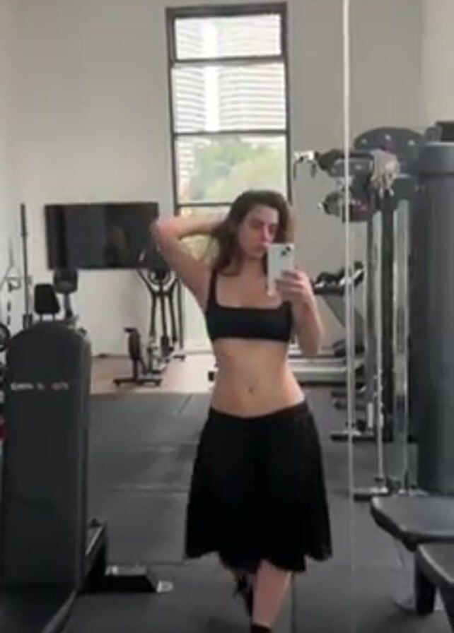 A woman is taking a video in a gym. She is wearing a black sports bra and black athletic shorts. She has medium-length curly brown hair. She is holding her phone up in front of her face in selfie mode. She poses in front of the mirror, running her hand through her hair and turning to show her back. In the background is gym equipment, black rubber flooring, and large windows. Outside the windows is a view of other buildings.