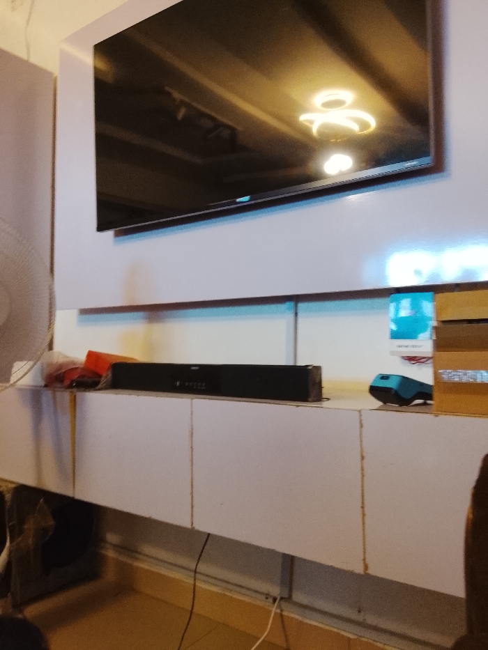 The image depicts an indoor scene within a building in Wukari, Nigeria. A large, black, flat-screen television is mounted on a light-colored wall. Its reflective screen shows a bright, multi-ringed ceiling light fixture and other overhead architectural details. Below the television, a white, multi-panel shelf unit is affixed to the wall. On the shelf unit, a black soundbar is centrally positioned. To the left of the soundbar, a collection of reddish-orange and clear plastic items rests. To the right of the soundbar, a dark teal-colored object is present, next to a light-blue piece of paper or card propped against a small, multi-tiered wooden organizer. A portion of a white, circular fan grille is visible on the far left. The floor is light brown or tan, and black and white electrical cables are visible on the floor and extending down the wall beneath the shelf unit. No individuals are present in the scene.