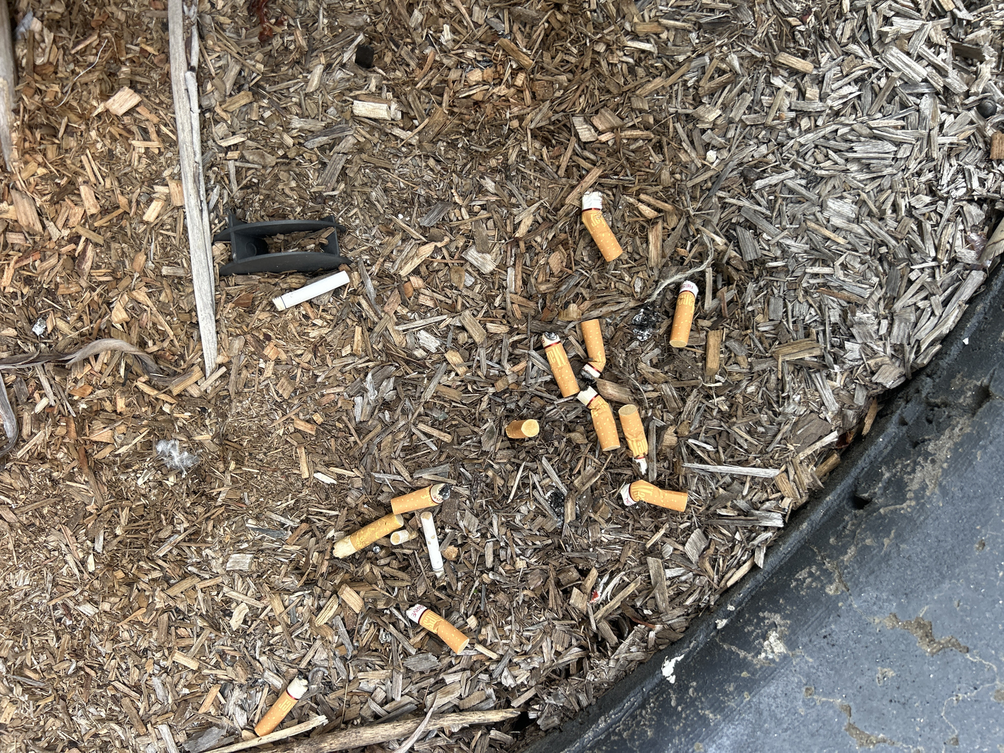 The image displays a ground-level view of a littered surface in Bulli, Australia. The dominant ground cover is a bed of irregularly shaped wood chips, ranging in color from light brown to grey. Scattered across these wood chips are approximately twenty-five discarded cigarette butts. The majority of these butts feature orange filters, with the word "BULLI" visibly printed on several of them in white text. The cigarette paper is white, often creased, with some butts displaying darkened, extinguished ends. Near the upper right portion of the frame, a dark, H-shaped plastic object rests among the wood chips. Other incidental debris includes several thin, dry plant fragments and small, light-colored fibrous material. Along the bottom left edge, a portion of a dark grey, textured surface, consistent with a concrete or asphalt curb or barrier, is visible. This surface exhibits various lighter-colored stains and deposits. No individuals or active interactions are depicted.