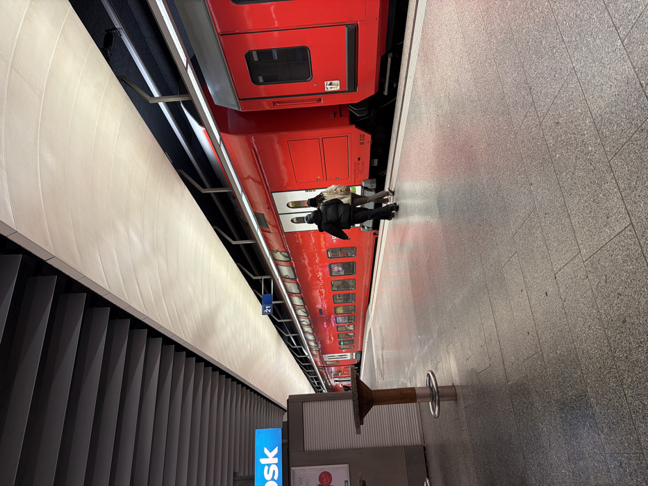 A red train sits at a platform. Two people are standing by the train door. The platform is tiled. The platform edge is visible. A metal and wooden stool is bolted to the floor. A blue sign with white lettering is near the stool. A wall with vertical panels is across from the train. The photo appears to be taken at an angle.