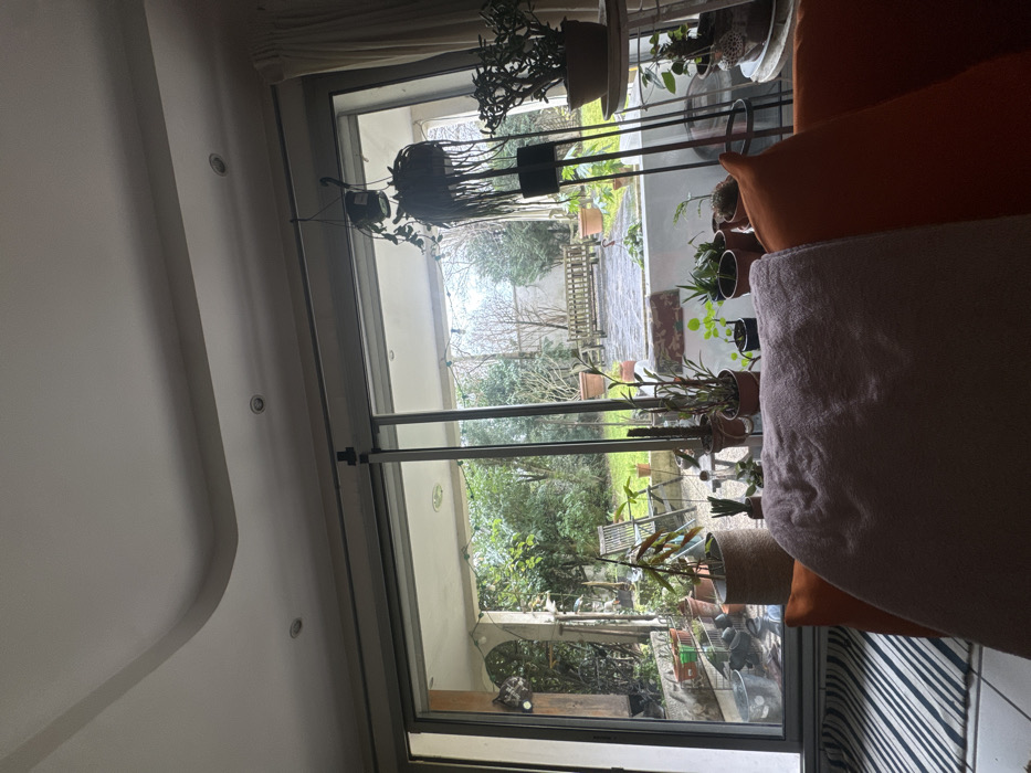 The scene depicts an interior view from a residence in Vincennes, France, looking out into a private garden through a wide sliding glass door. In the foreground, the edge of an orange sofa, partially covered by a light pink/purple blanket, occupies the lower right. A striped black and white rug is partially visible on the floor to the lower left. The white ceiling features recessed lighting and an architectural curve. Numerous potted plants, including succulents and trailing varieties, are arranged on the interior window sill and suspended from the ceiling. A tall, black metal plant stand on the right holds an additional potted plant. Beyond the sliding glass door, which is framed in metal and features a central vertical support, lies an outdoor patio area. This patio is partially paved, with several potted plants, an outdoor chair, and a string of decorative lights visible. The ground appears damp. Beyond the patio, a green lawn transitions into a garden featuring dense trees and foliage. In the mid-ground of the garden, a wooden park bench rests on a paved section. A wooden fence is visible in the background, behind the trees. No individuals are present in the image.