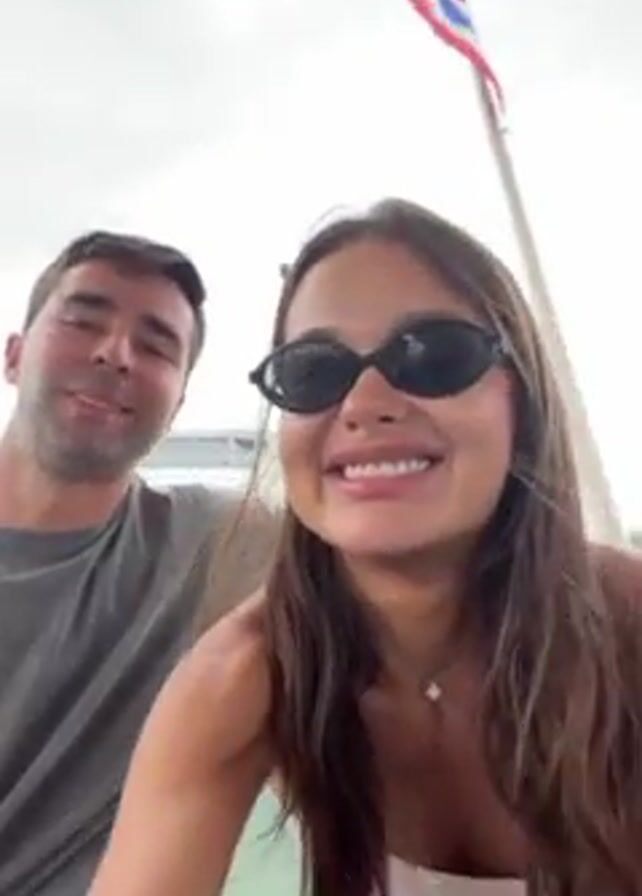 A man and a woman are taking a selfie outdoors, possibly on a boat or near a waterway