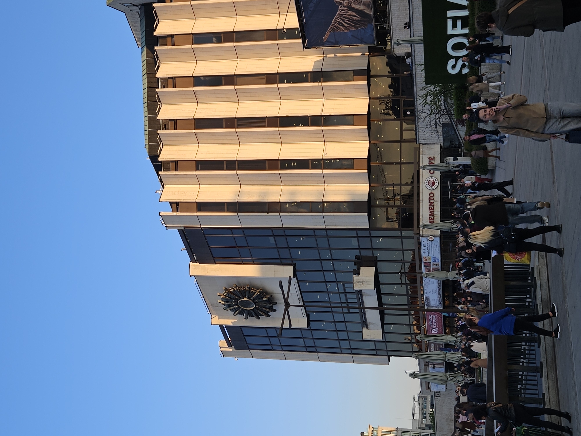 building in Sofia, Bulgaria. The building has a modern design with a facade of glass and horizontal panels. The word "SOFIA" is written in large, white letters on a green sign next to the building. There are people walking along a paved area in front of the building, and tables and umbrellas suggest an outdoor cafe or restaurant. The sky is clear and blue.