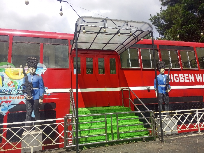 This image displays a static, repurposed red double-decker bus-like structure located outdoors in Cipanas, Indonesia
