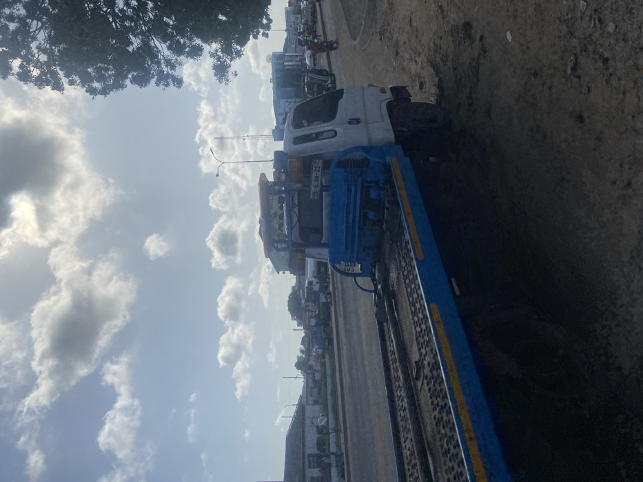 A white tow truck with a blue flatbed is parked on the side of a paved road. The tow truck is facing right with the driver's side visible. The tow truck has its lights on and the license plate reads “S. 3.34-21.” There is a small tree in the background to the right of the truck. There is another tow truck in the distance, as well as other vehicles. The sky is cloudy and bright, with the sun shining through the clouds. The location is a street in Weija, Ghana.