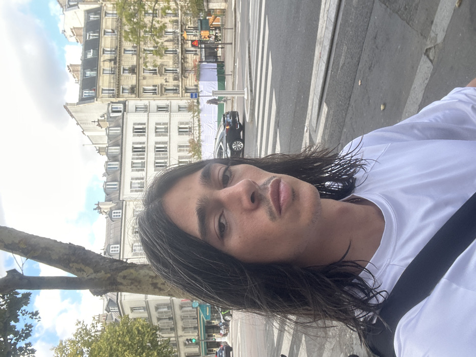 - "The image captures a selfie of a young male with long, dark, wet-appearing hair, a light complexion, and a sparse mustache, wearing a white short-sleeved t-shirt and a dark shoulder strap" by FM-KRgCp1, licensed under CC BY 4.0