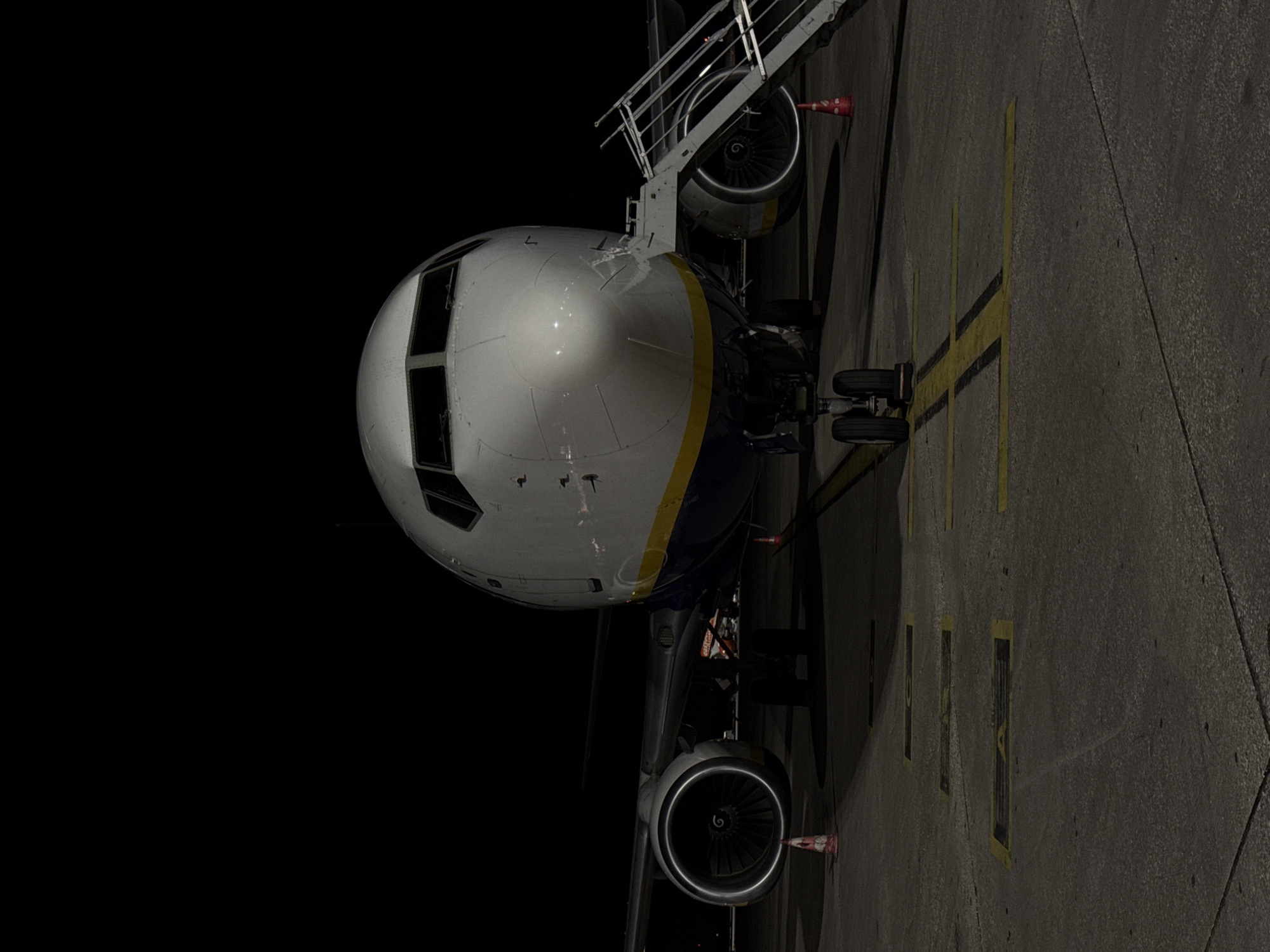 - "A commercial passenger aircraft, identified as a Boeing 737-type with a white fuselage, blue mid-stripe, and yellow accent stripe (consistent with Ryanair livery), is stationary on an asphalt tarmac under artificial lighting during nighttime" by FM-euyLP2, licensed under CC BY 4.0