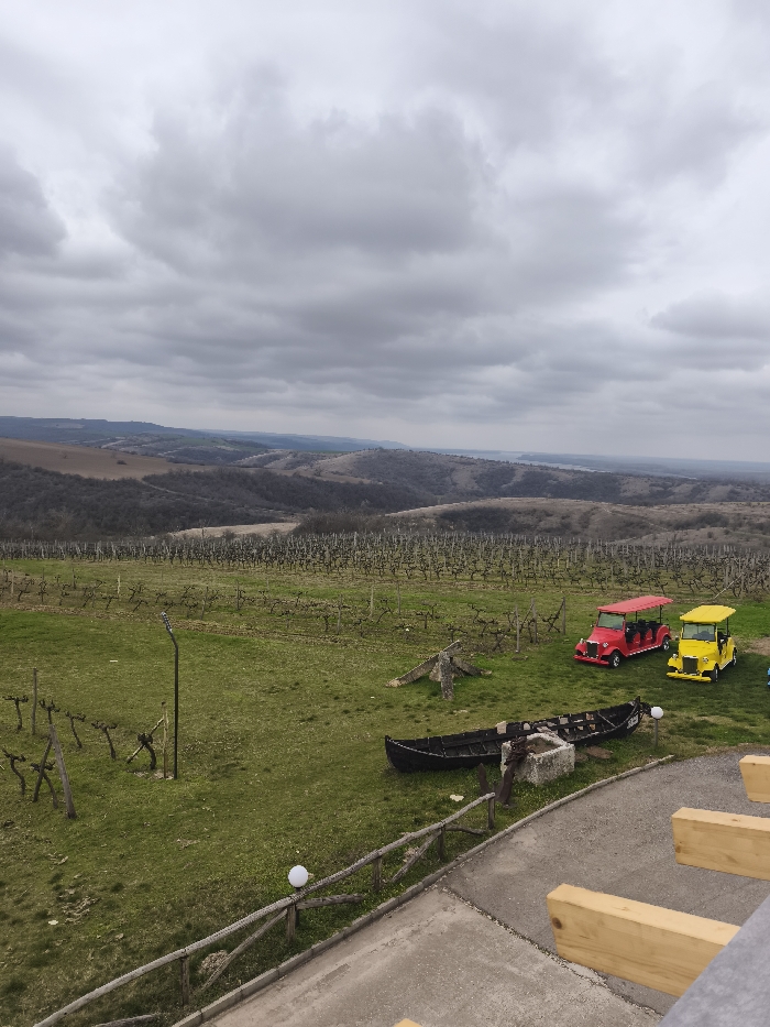 The image presents an expansive outdoor scene in the city of Mechka, Bulgaria, under an overcast sky dominated by uniform gray clouds. In the foreground, the lower right section features a concrete surface, likely a path or terrace, bordered by a rustic wooden fence railing. Two spherical white light fixtures are mounted on this railing. Partially visible in the extreme lower right are several light-colored wooden beams, suggesting a structural element such as a balcony. The mid-ground is a verdant grassy area, transitioning into an extensive vineyard. The vineyard consists of numerous dormant, gnarled grapevines, indicating a cool season. Within this grassy expanse, two unoccupied vintage-style open-top vehicles are positioned: one red with a red canopy and one yellow with a yellow canopy. To the left of these vehicles, a dark, elongated wooden boat rests on the grass, next to a stone structure resembling a wellhead or monument. A slender, dark-colored lamp post with a multi-directional light fixture is planted in the grass closer to the left edge of the frame. The background reveals a vast, undulating landscape of hills and valleys, predominantly covered in bare trees, brown vegetation, and some agricultural fields. A narrow body of water, consistent with a river or lake, is visible winding through the distant terrain. No individuals are present in the scene.