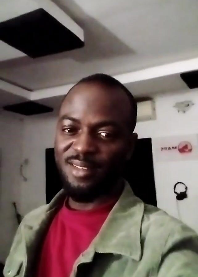 A man wearing a red shirt and a green jacket is standing in what appears to be a recording studio. The studio has acoustic panels on the ceiling and walls. There is a stool, a tripod, headphones, and a speaker visible in the background. The man is looking at the camera and speaking. The camera is close to the man's face, suggesting he is recording a selfie video.