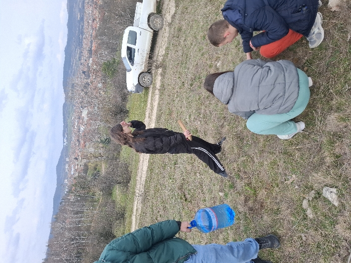 The image depicts an outdoor scene from an elevated, unpaved terrain overlooking the city of Panagyurishte, Bulgaria. The sky is overcast. In the foreground, four individuals are present on dry, sparse grassy ground. On the far left, a person, partially visible, wears a green puffer jacket and blue jeans, holding a large, approximately 5-gallon, blue plastic water bottle in their left hand. In the center, a young female with long, dark hair, dressed in a black puffer jacket and black track pants with white side stripes, stands with her left hand near her face and holds a light-colored wooden stick in her right hand, pointed downwards. To the lower right, two individuals are crouched on the ground. One young female, with her back to the camera, wears a grey puffer jacket and light teal pants. Facing her is a young male in a dark blue puffer jacket and bright red pants; he appears to be interacting with her hands or something on the ground. A white four-door pickup truck is positioned on an unpaved dirt track in the mid-ground to the right, facing slightly downhill. The background reveals the cityscape of Panagyurishte, characterized by numerous buildings with red-tiled roofs, nestled in a valley. Hills covered with sparse, mostly deciduous trees are visible beyond the city.