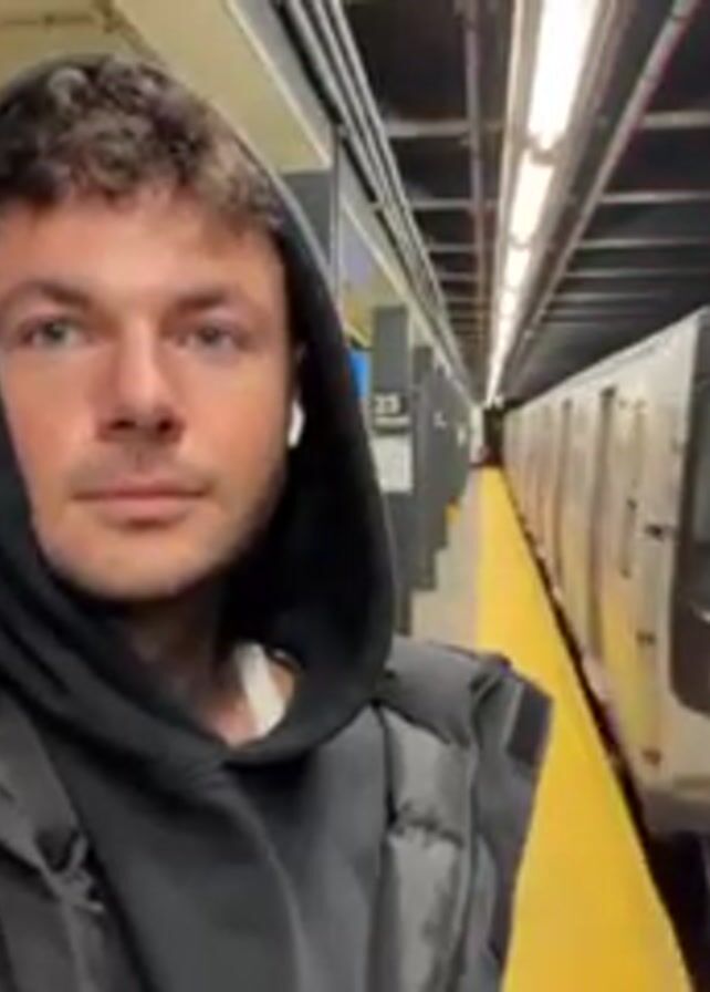 A man with short curly hair, wearing a black hoodie and a dark vest, stands in front of a New York City subway platform taking a selfie video