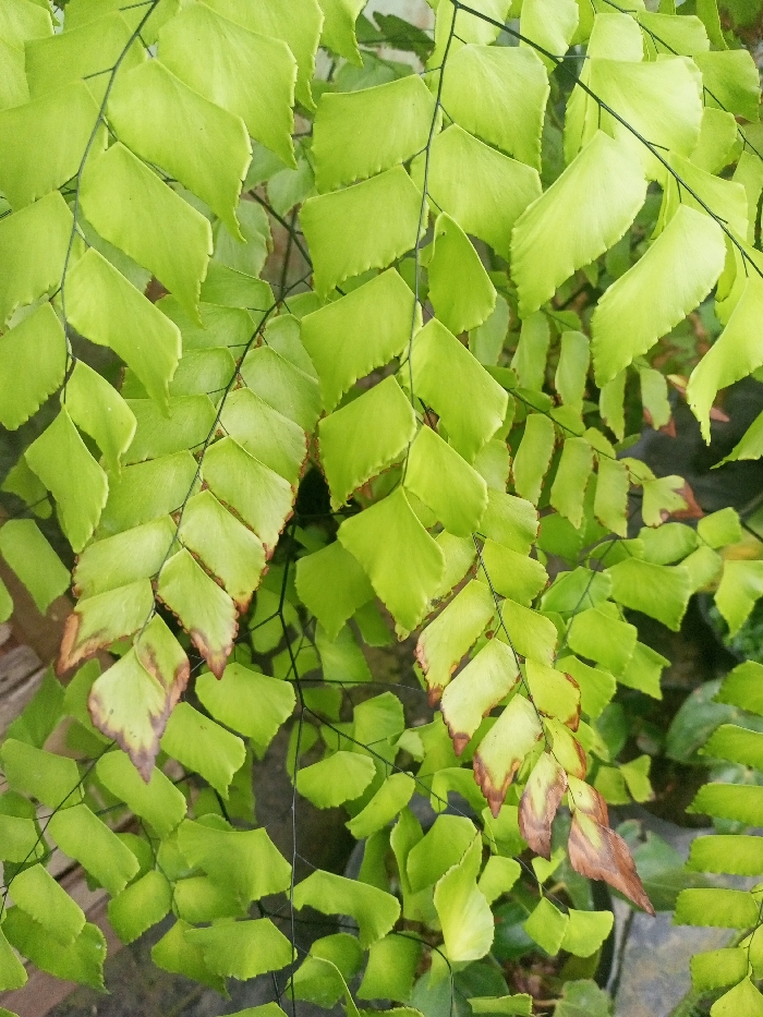 The scene depicts a close-up view of a fern plant, identified as originating from Bamhori, India. The image is dominated by numerous light green, fan-shaped to rhomboid pinnules arranged along delicate, dark, wiry petioles and rachises. The pinnules display crenate margins. A significant portion of the lower and central pinnules exhibits varying degrees of desiccation and necrosis, characterized by reddish-brown to dark brown discoloration along their edges and tips. The background is out of focus, showing indistinct green and dark tones, suggesting other foliage or obscured ground. No human subjects, animals, or specific man-made objects are visible within the frame. The lighting appears natural and even.
