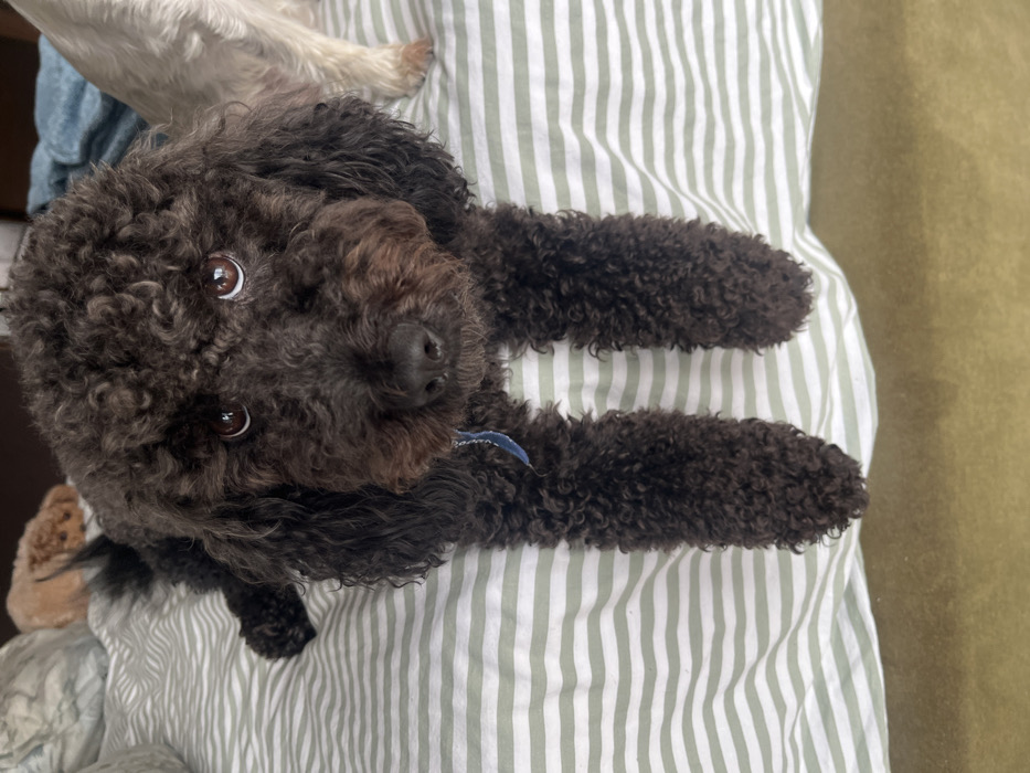 - "The image displays a dark brown dog with dense, curly fur and prominent dark eyes, lying prone on a bed" by FM-lAJLT2, licensed under CC BY 4.0