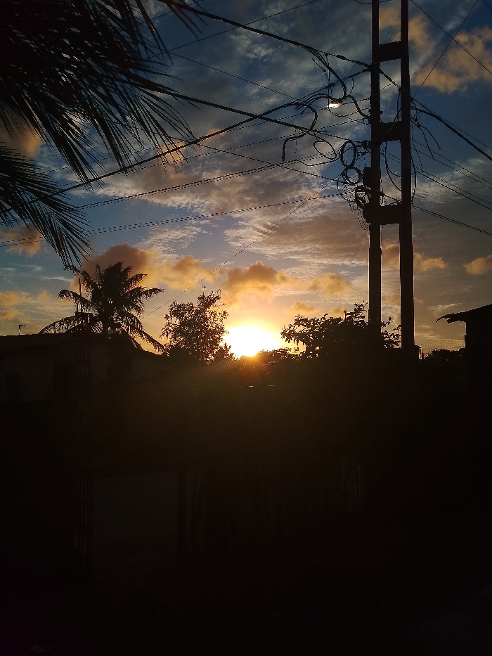 A scenic view captures a sunset. Wispy, golden-hued clouds stretch across the sky, with the sun low on the horizon. Dark silhouettes of trees and buildings stand against the bright sun. A palm frond is visible in the left corner. Power lines and a utility pole bisect the upper sky. The foreground is dominated by a dark, undefined space, creating a contrast to the illuminated sky.