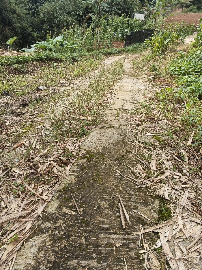 A weathered concrete path extends uphill, flanked by abundant greenery. Various plants and weeds thrive along its edges, while scattered dry leaves cover the surface. The path shows signs of wear, with cracks and moss growth. Lush foliage, including leafy plants and vine crops supported by stakes, borders the path, suggesting a cultivated or semi-wild garden setting. The overall scene conveys a rustic, overgrown atmosphere.