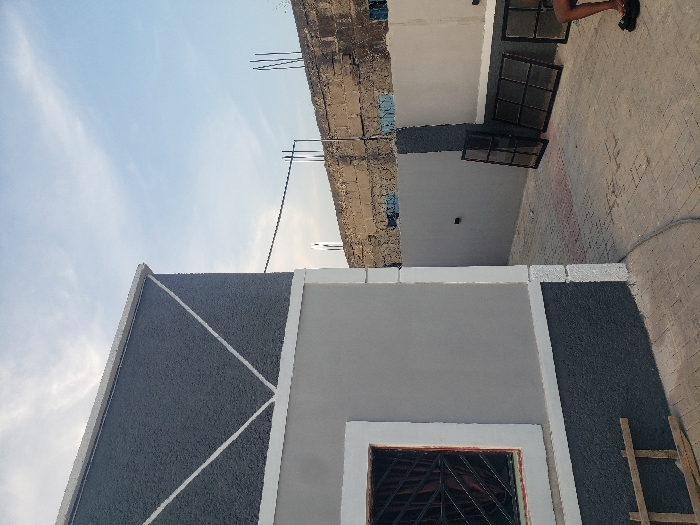 The scene depicts an outdoor area adjacent to a newly constructed or renovated building in Sabon Tasha, Nigeria. The building, visible on the left, features light grey and dark grey textured exterior walls with white decorative trim and window framing. A single window with dark security bars is visible, appearing unglazed. At the base of the building, unfinished wooden supports are present. The ground is paved with light-colored interlocking pavers. Towards the right, three dark-framed window units lean against a light grey perimeter wall. Beyond this wall, a rough, unpainted concrete block wall with exposed rebar extends, suggesting ongoing construction or an unfinished boundary. The lower legs and feet, clad in dark sandals, of one individual are partially visible on the far right. The sky overhead is light blue with scattered white clouds. A black hose runs across the paved ground near the building.