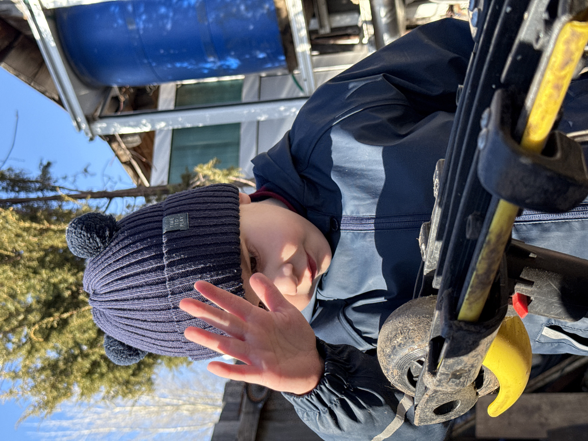 An outdoor scene in Chaikovsky, Russia, depicts a young child, likely male, from the chest up under bright sunlight. The child wears a navy blue ribbed knit hat with two pom-poms and a tag reading "TIME TO PLAY", along with a navy blue jacket featuring lighter stripes on the sleeves. A maroon collar is visible beneath the jacket zipper. The child's left hand is raised with fingers spread, partially shielding his face, while his gaze is directed downwards toward a black and yellow object he holds. This object, possibly a toy crossbow or similar device, features a dirty, rubber-like wheel, a yellow hooked element, and a red button on its black frame. In the background, to the left, are bare deciduous trees and green coniferous foliage against a clear blue sky, partially obscured by a fence. To the right, a light-colored building with a sloped roof and a large, vertical blue plastic barrel are visible.