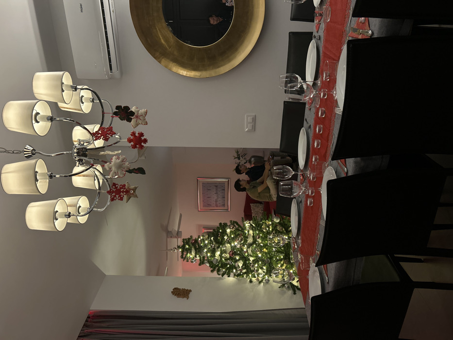 A warmly lit dining room features a decorated Christmas tree visible through an opening. A table is set for a holiday meal with place settings and a red runner. A modern chandelier adorned with holiday decorations hangs above. A gold-framed mirror reflects the room, and a painting adorns the wall in the distance. Two people are seated at the far end of the room, engaged in conversation. Curtains are visible at the bottom of the frame.