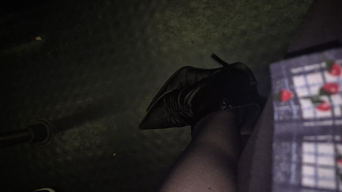 The image presents a close-up, low-angle view of an individual's lower left leg and foot within a dimly lit interior space in the city of Paris, France. The leg is encased in sheer black hosiery, terminating in a black, pointed-toe, high-heeled ankle boot featuring a zippered side closure and ruched leather detailing. The lower edge of a garment, likely a skirt or dress, patterned with white grid lines and red strawberry motifs, is visible in the immediate foreground. The floor beneath is dark and appears to be a textured, non-reflective surface. In the upper background, a dark vertical metal pole, possibly a furniture leg, is visible, casting a distinct shadow on the floor. The overall lighting is dim, indicating an indoor setting under artificial illumination.