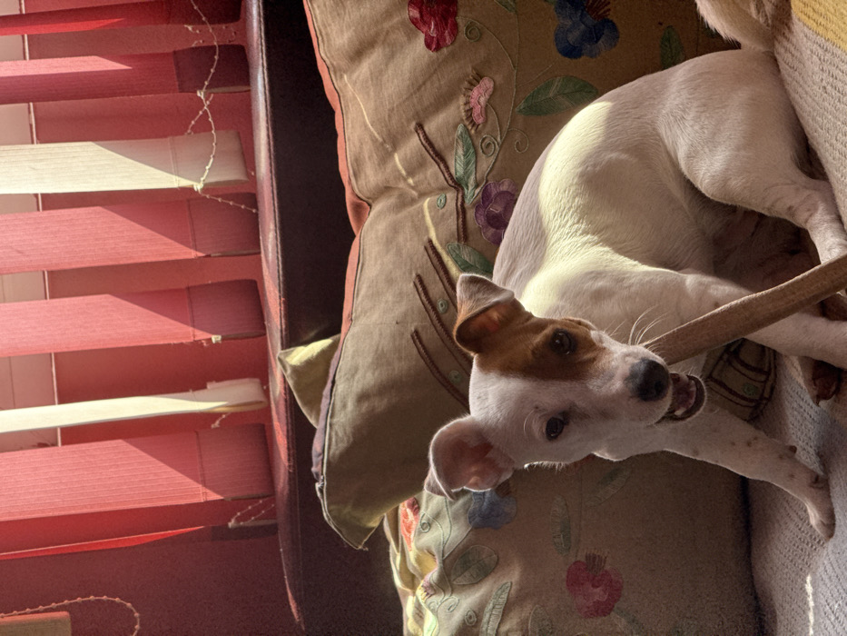 The scene is an interior room in Galabovtsi, Bulgaria, illuminated by strong natural light. A small, predominantly white dog with brown patches on its head and ears is centrally positioned, sitting on a light-colored, upholstered surface, likely a sofa or armchair. The dog is actively chewing on an elongated, light-tan, rigid object held between its front paws; its mouth is open, revealing teeth. Multiple floral-embroidered throw pillows in shades of green, brown, red, and blue are arranged behind and to the sides of the dog. In the background, a series of vertical window blinds, primarily reddish-orange with some lighter-colored slats, are visible. Direct sunlight from an unseen source casts distinct diagonal shadows from the blinds onto the interior surfaces, highlighting areas of the dog and furniture. No human subjects are visible within the frame.