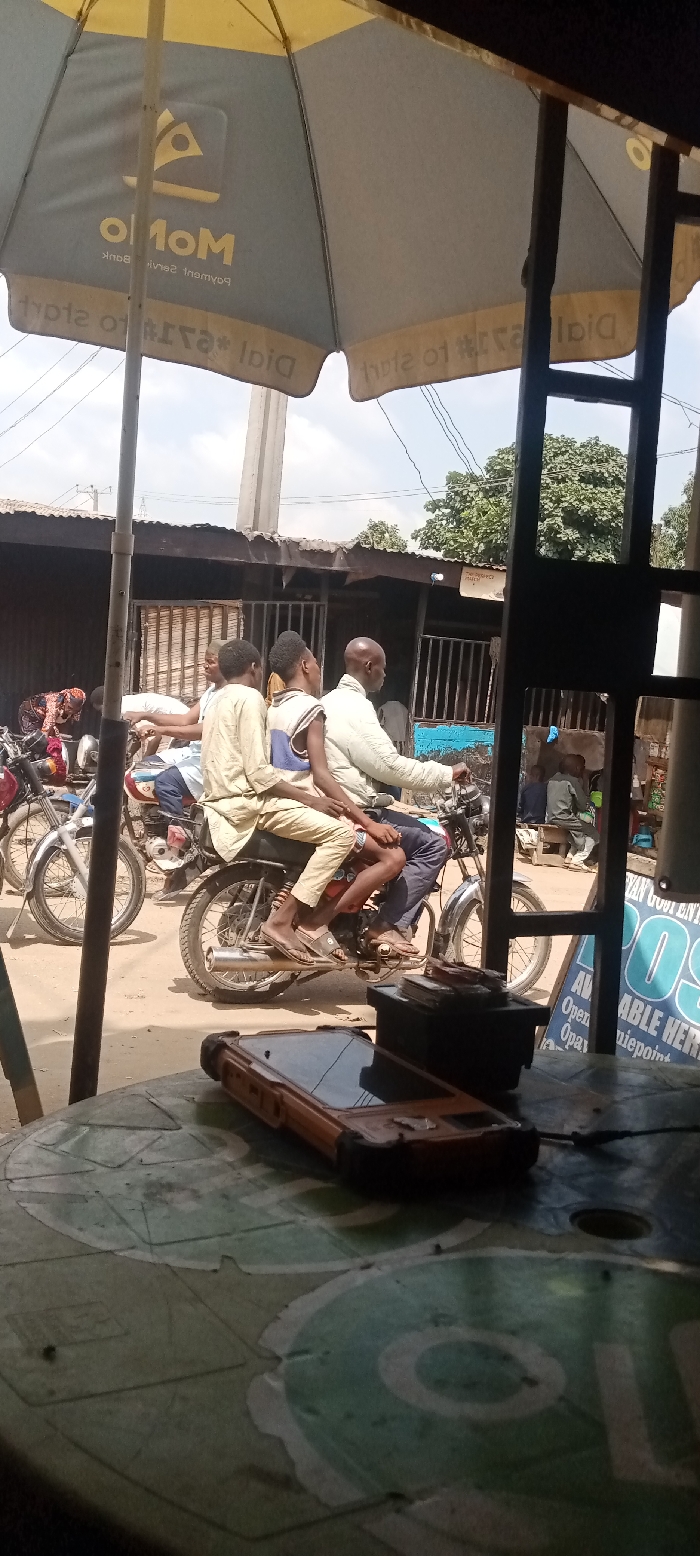 The image captures an outdoor street scene in Iddah, Nigeria, observed from a low vantage point, possibly from a café or roadside stall. In the immediate foreground, a weathered green and dark-patterned table surface holds an orange-cased smartphone, face down, and a small black rectangular object. Above, a section of a grey and yellow promotional umbrella is visible, displaying a reversed "MoMo Payment Bank" logo and text. The middle ground features a dirt road with multiple individuals on motorcycles. A central motorcycle is occupied by three adult males. The driver, bald and wearing a light-colored long-sleeved shirt and dark trousers, steers the vehicle. Immediately behind him sits a younger male in a sleeveless vest over a light shirt and dark trousers. A third male passenger, wearing a light-colored tunic and trousers, sits at the rear. Another motorcycle is partially visible to the left with additional occupants. Further left, a person in patterned clothing and a head covering appears to be attending to something near a parked motorcycle. The background consists of a row of single-story structures with corrugated metal roofs, indicative of shops or residences. Some buildings feature metal security grates or doors. A utility pole and overhead power lines are visible against a bright, hazy sky. Green tree foliage is present in the upper right portion of the background. A partially obscured blue sign in the mid-right background advertises "POS Available Here" and mentions "Opay" and "Poinpoint."